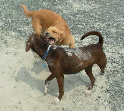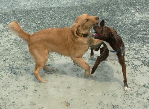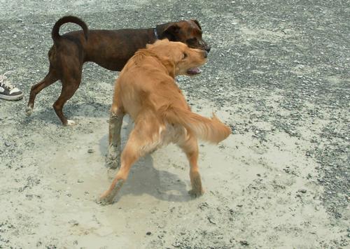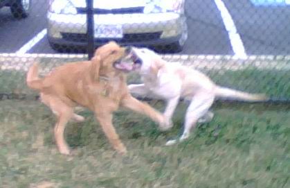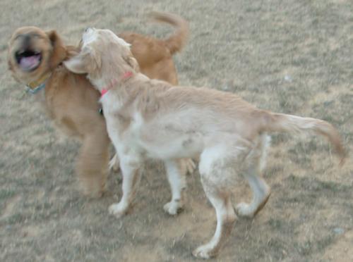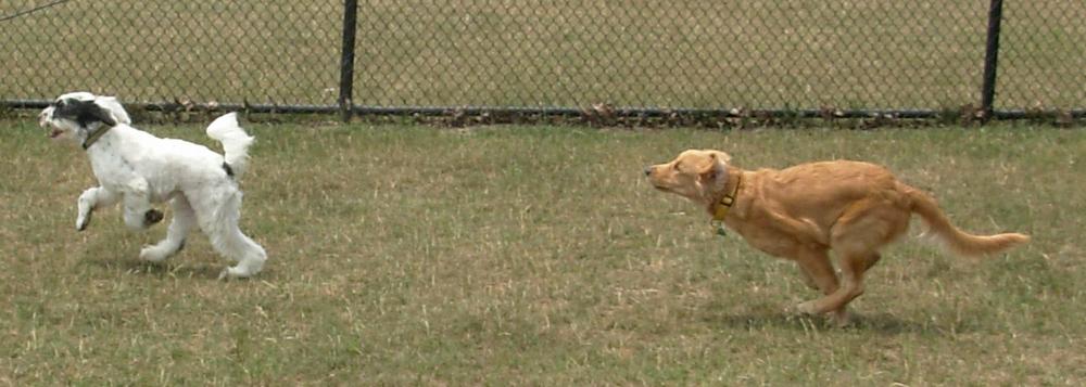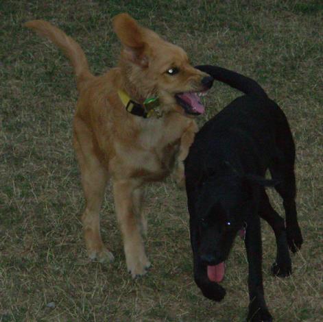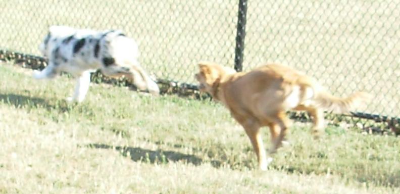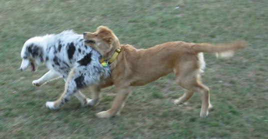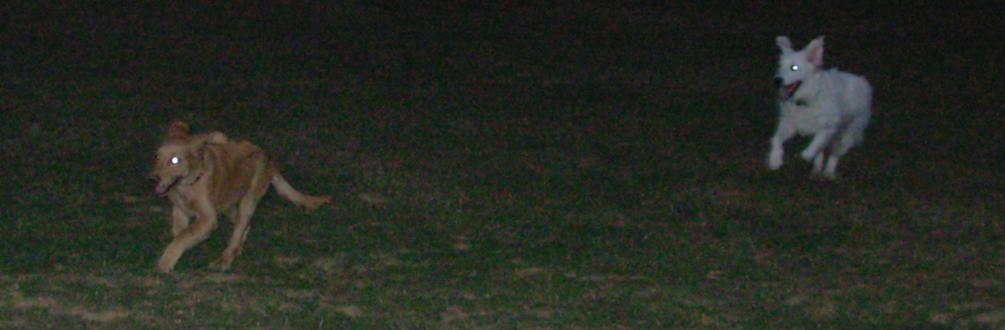 DOG PARK! Emma playing with a white (!) Golden Retriever at dusk