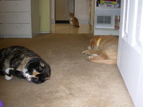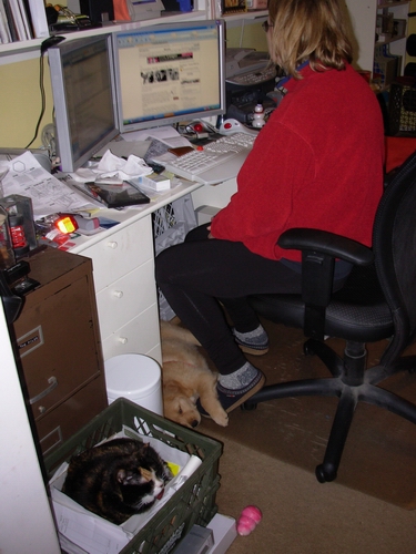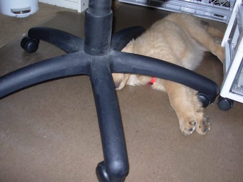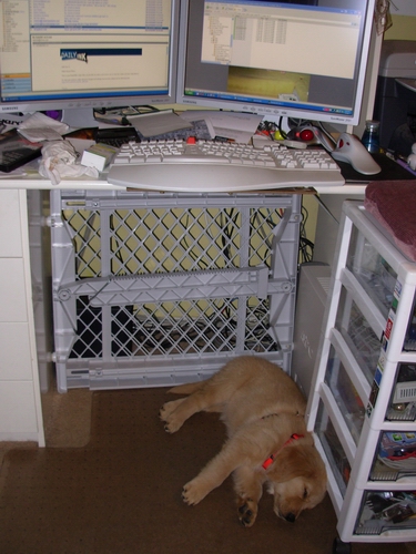 Compare & contrast, sleeping under the computer desk: Left, 20 April 2007 | Right, 8 July 2007