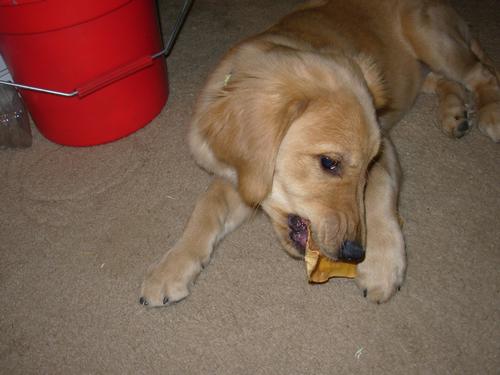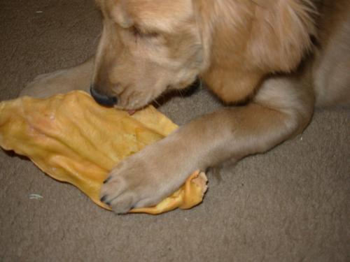 Chewing on a cow ear.. . . . . .