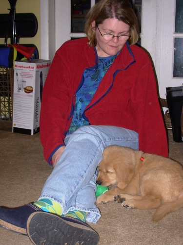 Julie causing puppy bliss; puppy assisting Monte washing dishes... (note Emma's gnawed contribution to the bottom edge of the kitchen cabinet)