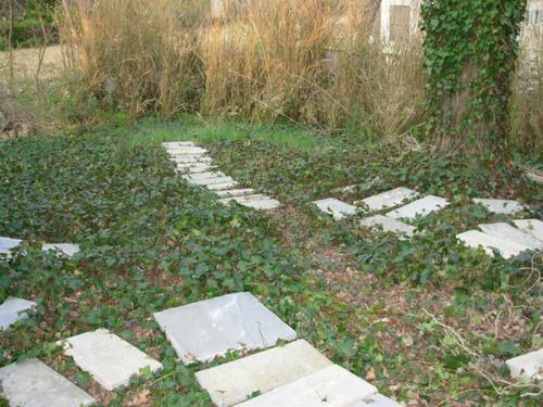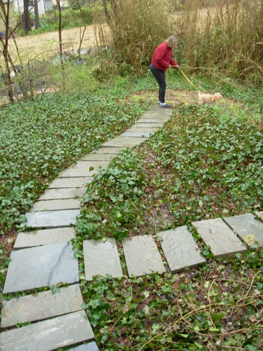 Getting the backyard ready, a few days before she'll be coming home, arranging newly-purchased flagstones:
