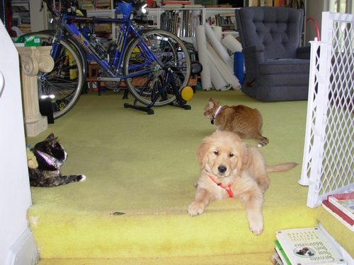 Emma just wants to play with the kitties, but they are emphatically not interested! (note that the Eames has now been moved out of harm's way, replaced with Jo's lazyboy...)